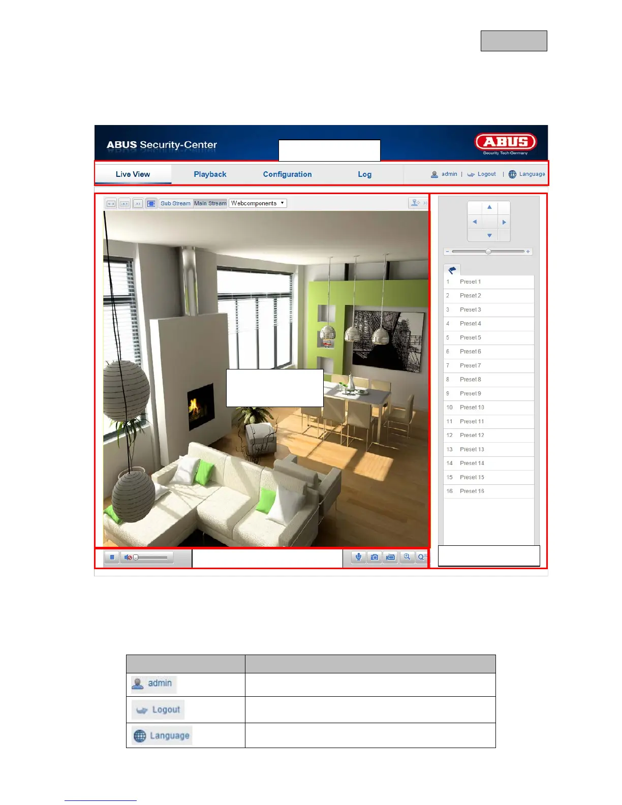 Open the network camera home page. The interface is divided into the following main areas: