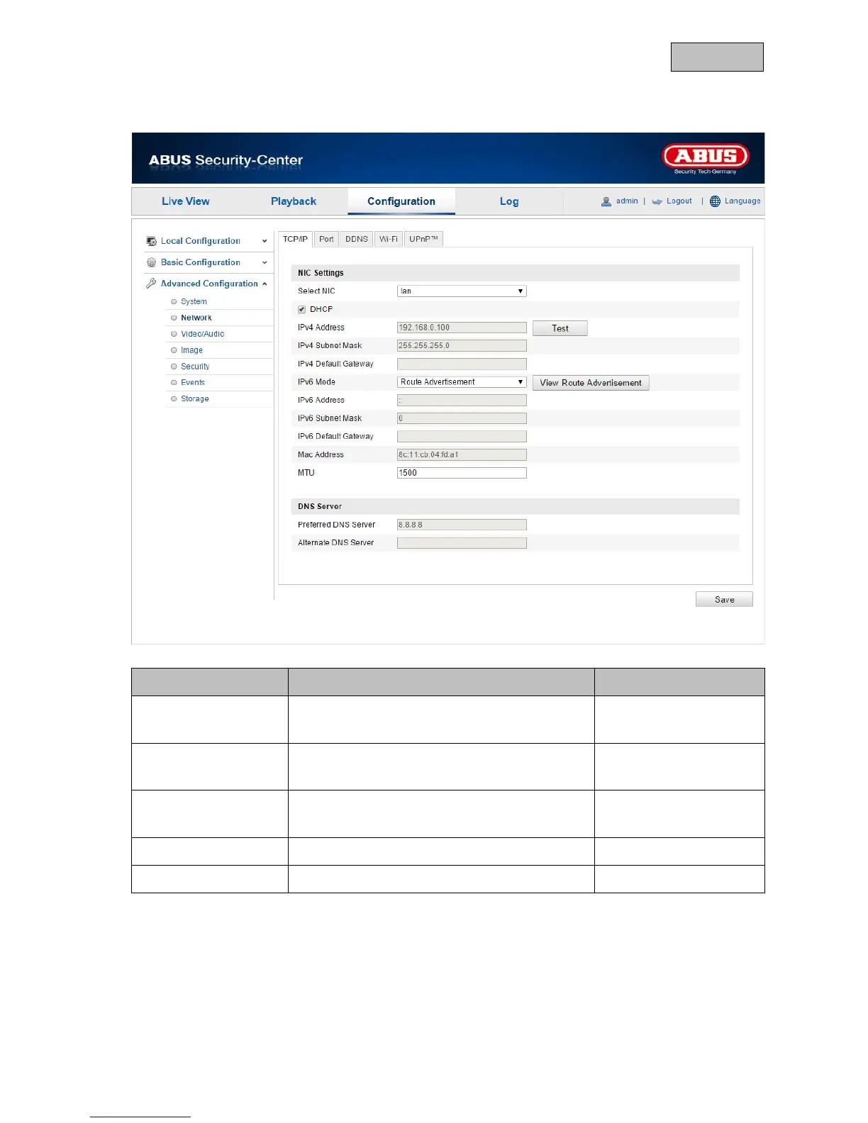 Settings for the UPnP data Advanced Configuration