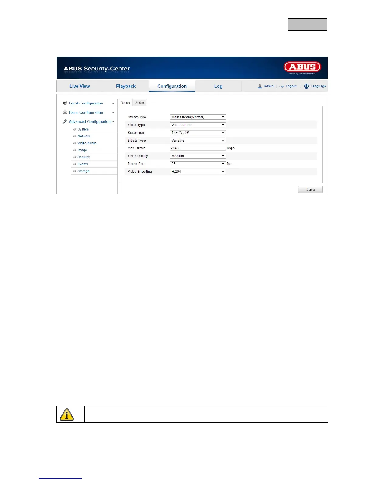 The bitrate of the video stream is set to a certain value. Set a max. bitrate of between 32 and