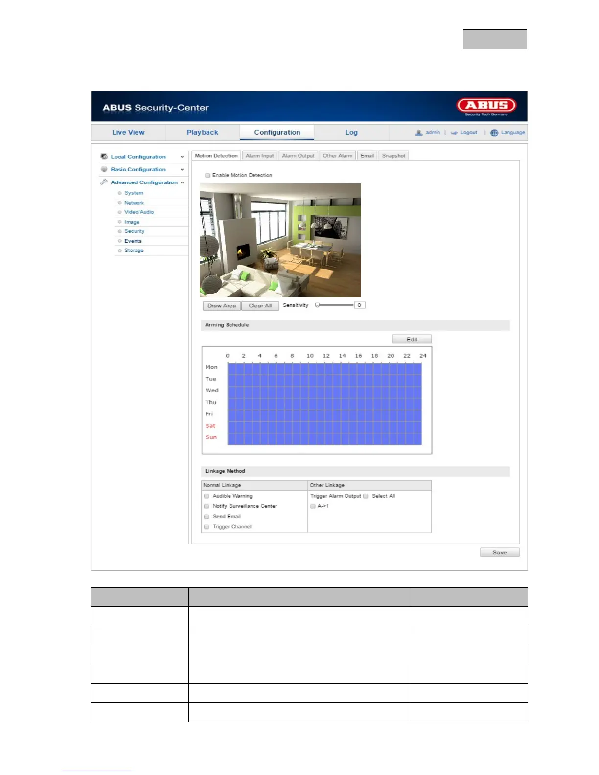 Settings for motion detection Advanced Configuration