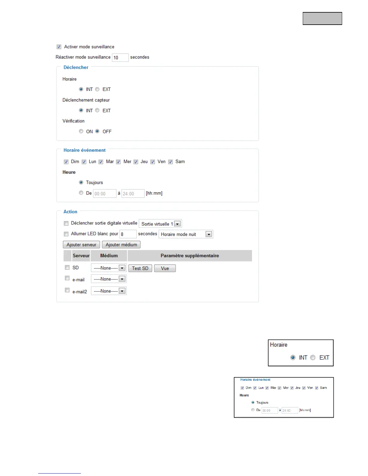 Horaire INT : L'horaire interne de la caméra est utilisé. Celui-ci peut être configuré