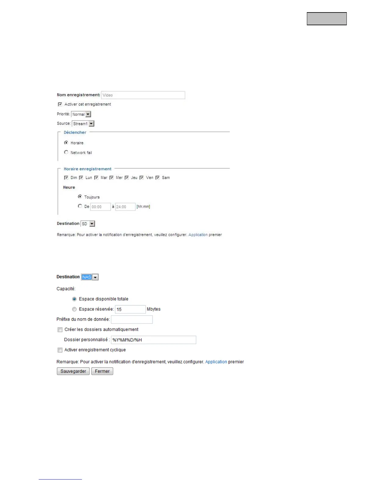 deux réglages enregistrement dans le caméra réseau. Pour créer un nouvel enregistrement, cliquez