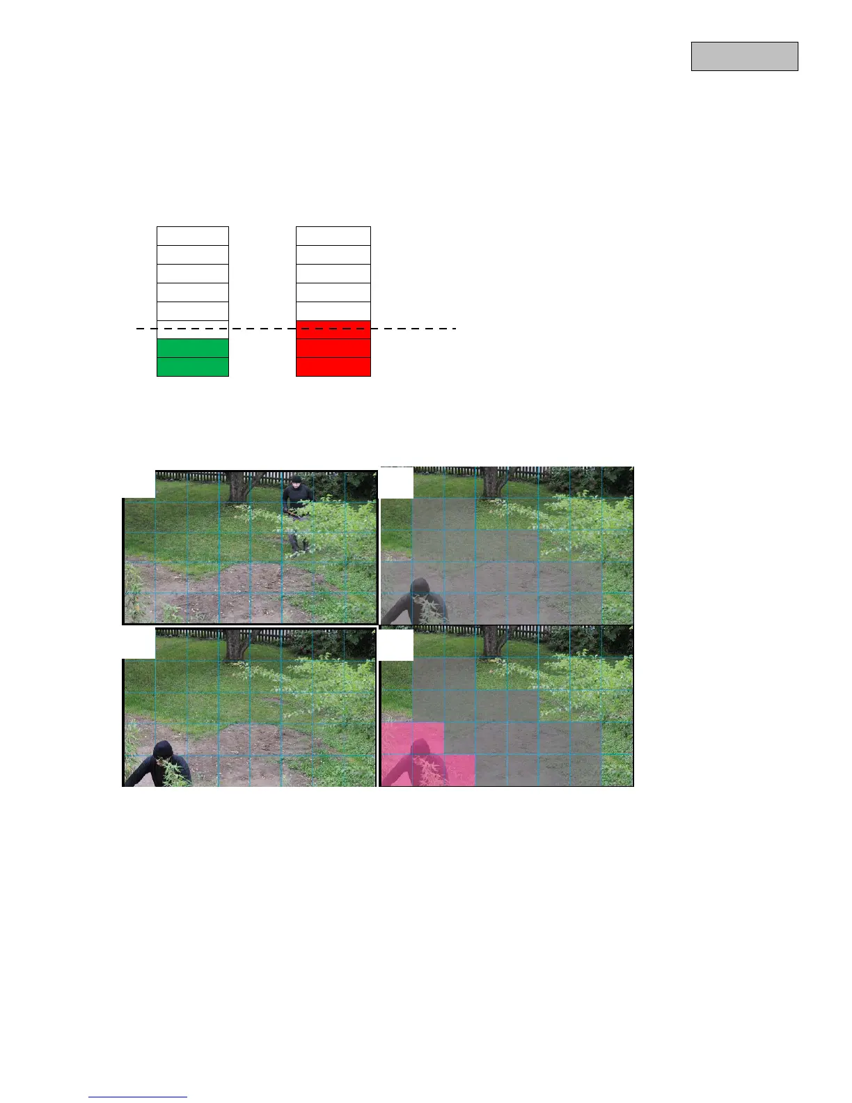 Roode bereik: beeldvariatie (beweging) overstijgt de grenswaarde van 30% en leidt tot een alarm.