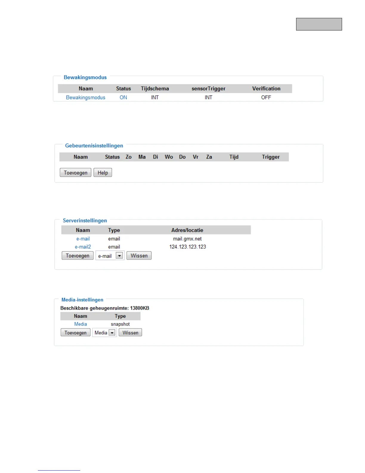 Hier worden de virtuele ingangen en uitgangen opgesomd. De camera beschikt steeds over twee virtuele