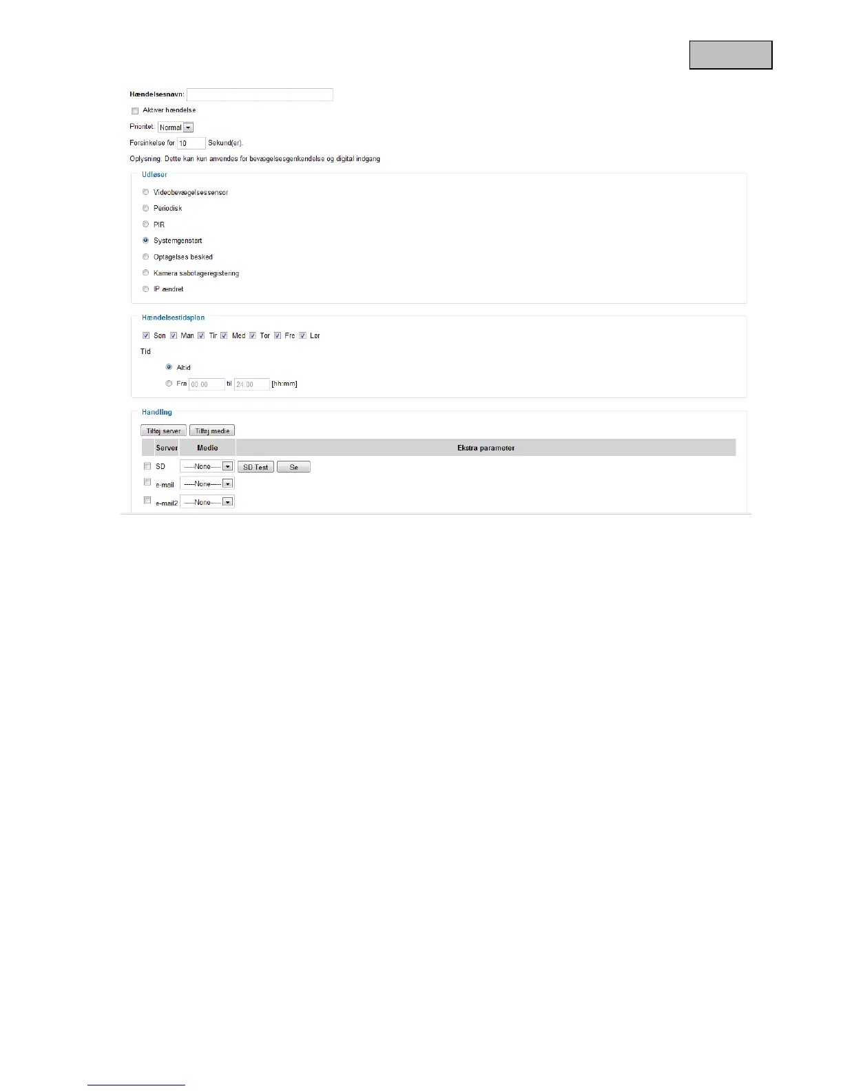“Systemgenstart” Hændelse udløses, når videoserveren genstartes (midlertidigt spændingstab)