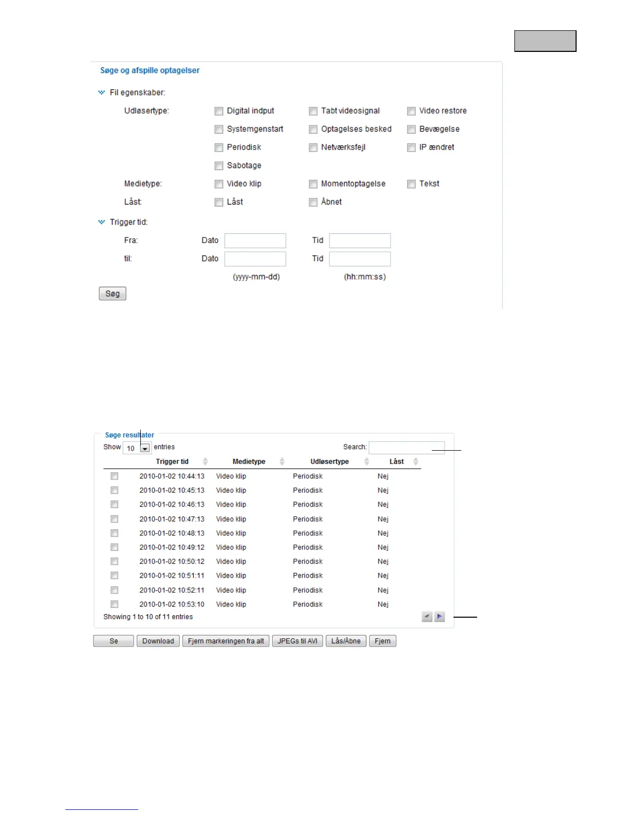 Klik på “Søg”. Alle de optagelser, der opfylder kriterierne, vises i resultatlisten.