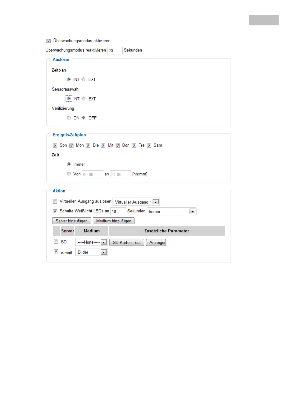 erfüllt sind (=UND-Verknüpfung), wird ein Alarm in der Kamera ausgelöst und die Anweisungen unter „Aktion“