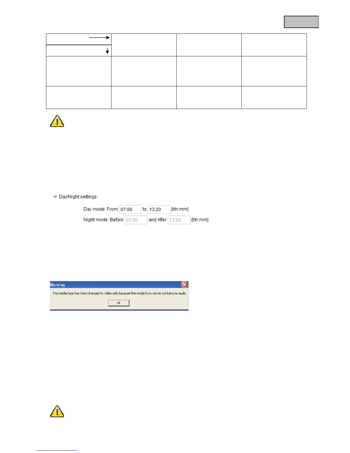 Define the settings for the camera day/night mode here. These settings are used for the following functions: