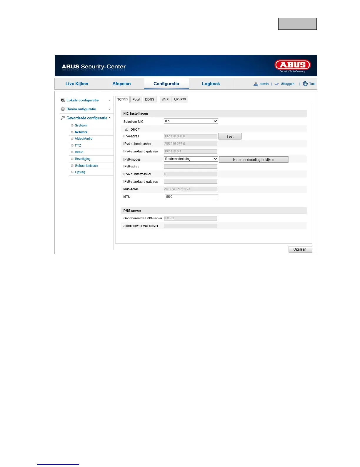 Kies de netwerkinterface die u wilt configureren. De camera kan via LAN of WLAN met het netwerk