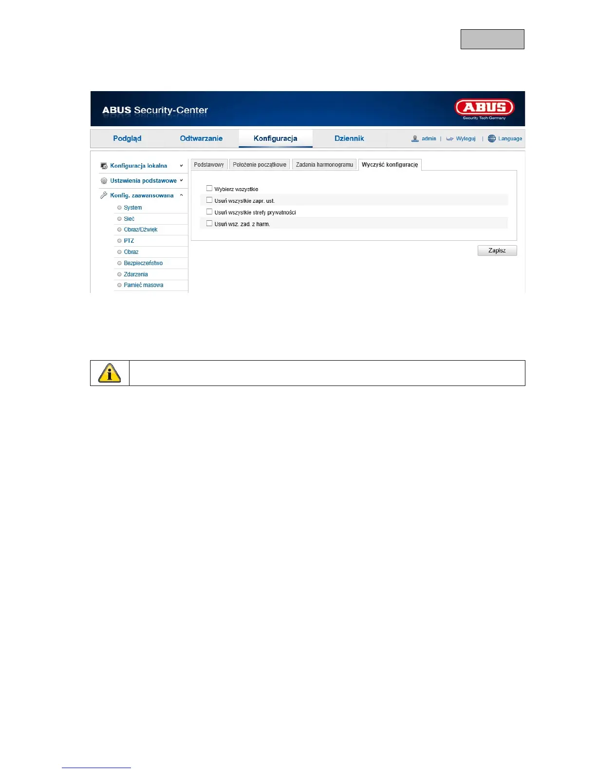 Za pomocą tej opcji można usunąć konfigurację PTZ.
