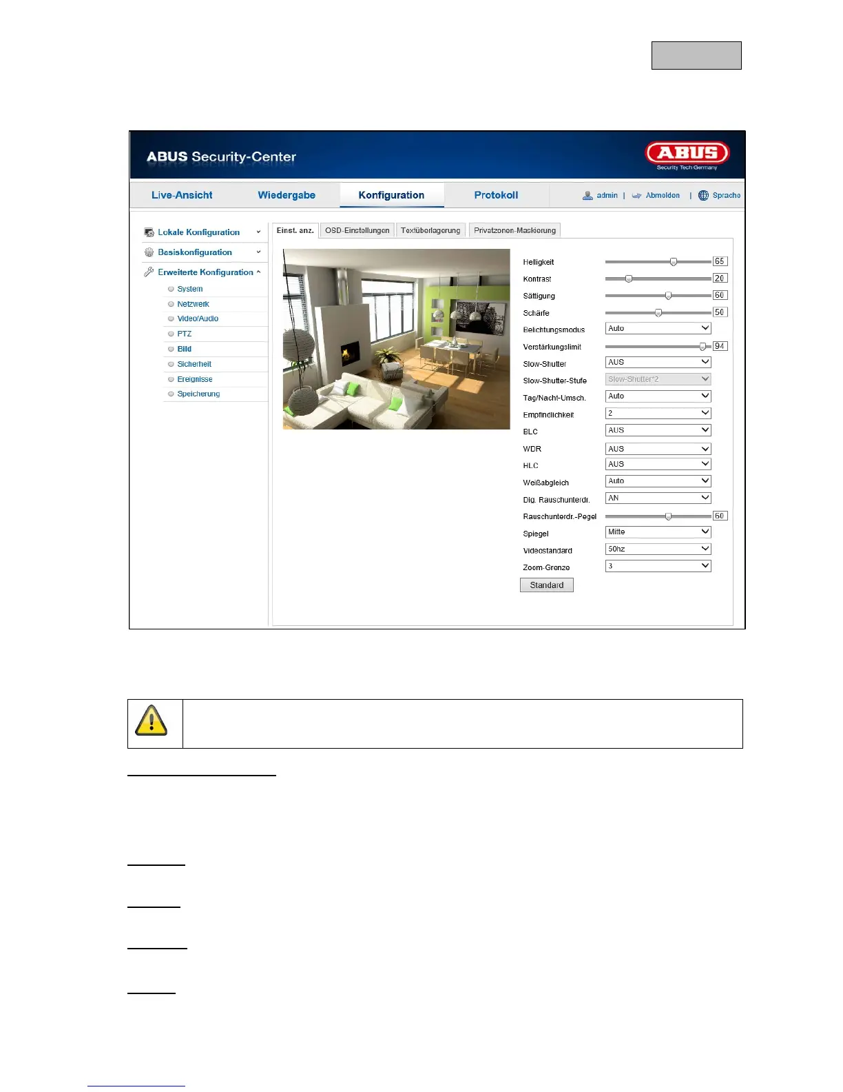Unter diesem Menüpunkt können Sie die Bildqualität der Kamera, einschließlich Helligkeit, Schärfe,