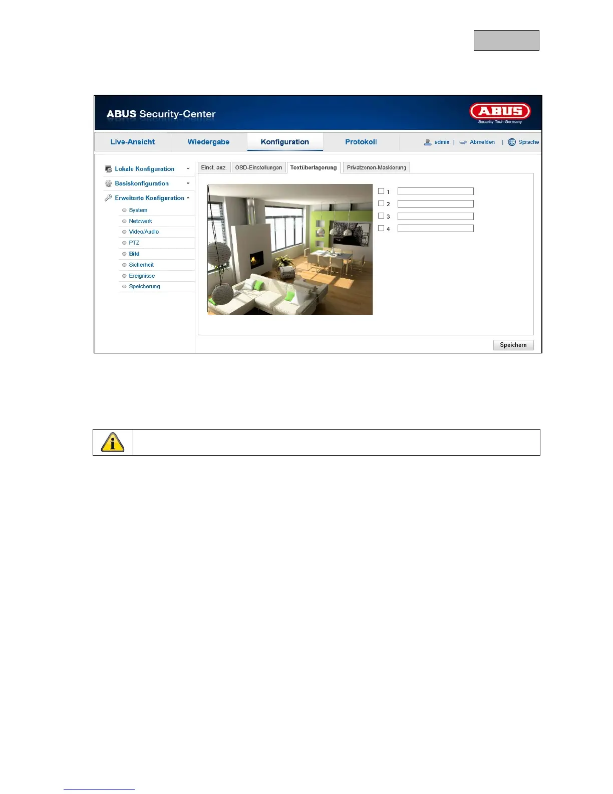 Sie haben die Möglichkeit bis zu vier Texte in das Kamerabild einzublenden, die maximale Länge