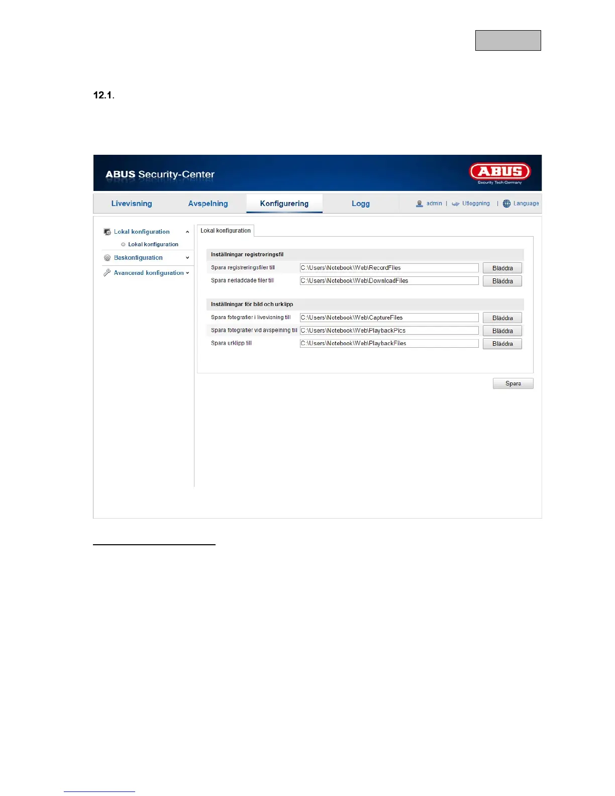 Under menypunkten ”Lokal konfiguration” kan du göra inställningar för filsökvägar till inspelningen och
