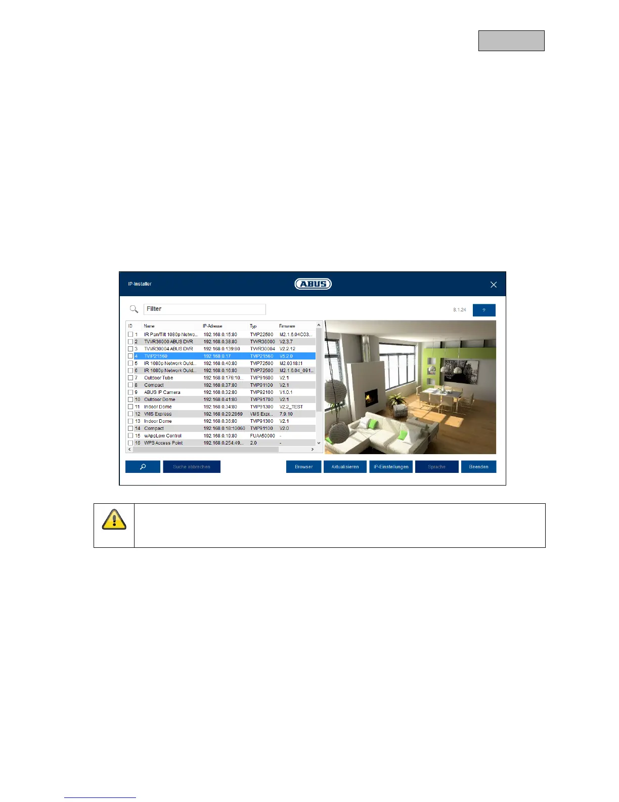The network camera is accessed for the first time using the ABUS IP Installer.