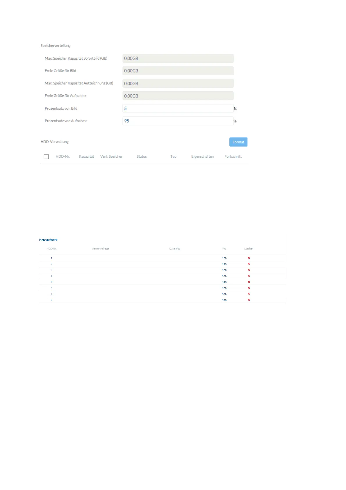 NAS: Konfigurieren Sie bis zu 8 NAS Geräte. Klicken Sie in eine Zeile um Server-