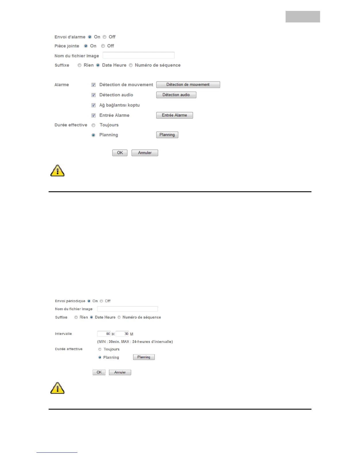 Intervalle : détermination de l'intervalle d'envoi. La durée minimale est de 30 minutes.
