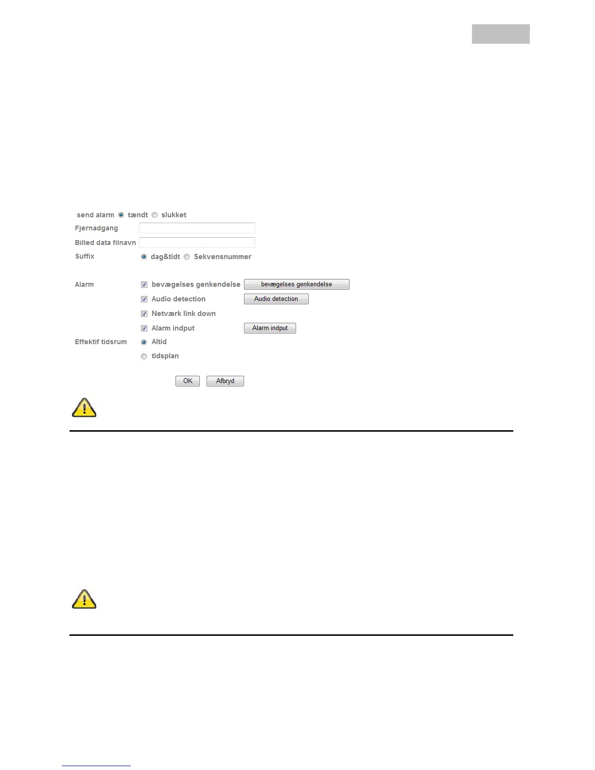 Alarm: I tilfælde af alarm kan der her konfigureres bestemte hændelsesreaktioner for FTP-