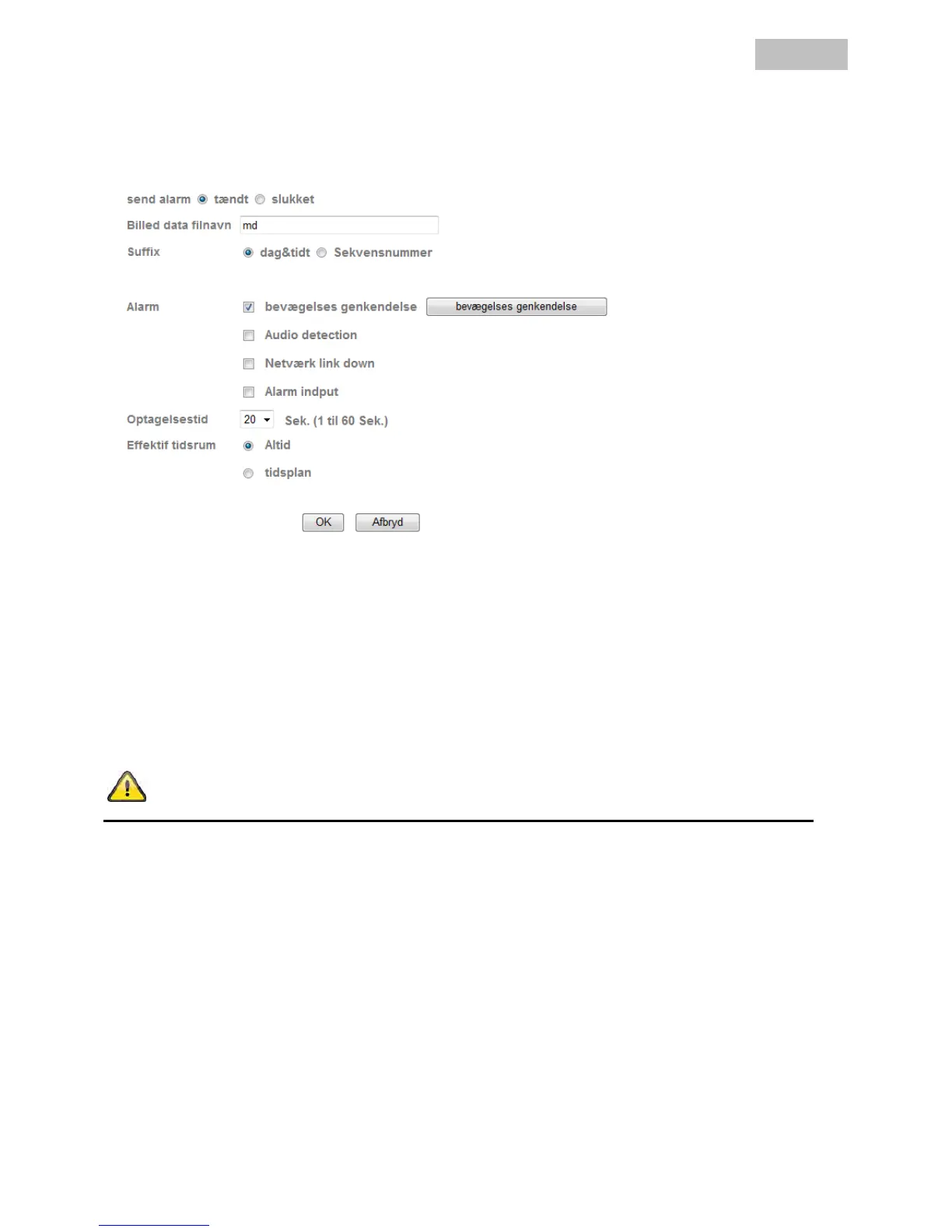 Alarm: I tilfælde af alarm kan der her konfigureres bestemte hændelsesreaktioner for