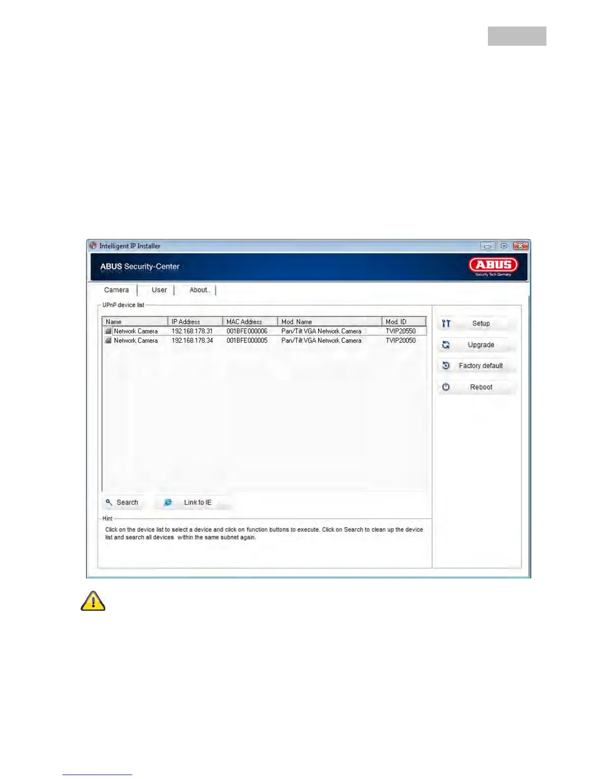 The network camera is accessed for the first time using the IP Installer.