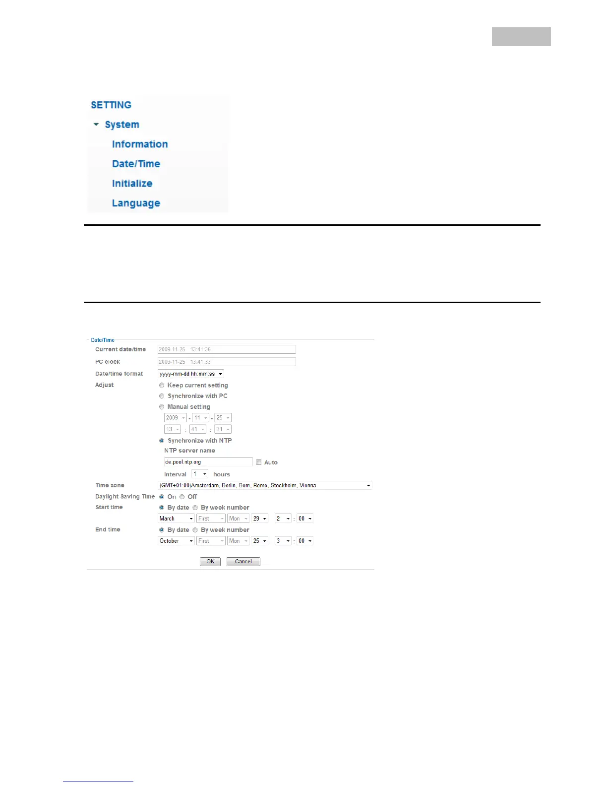 Synchronize with NTP: Automatic update of date and time settings via a time server (Network