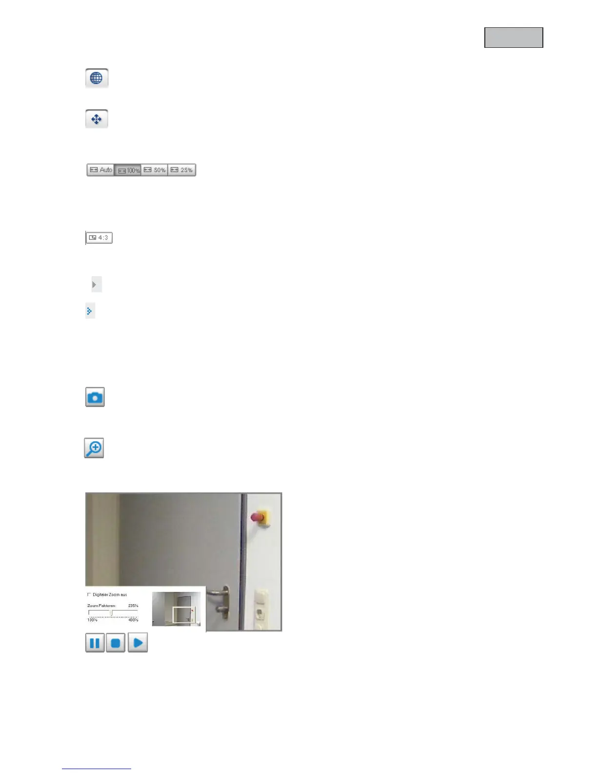 Using these buttons, you can choose from three different zoom levels for the live picture (100%, 50% and