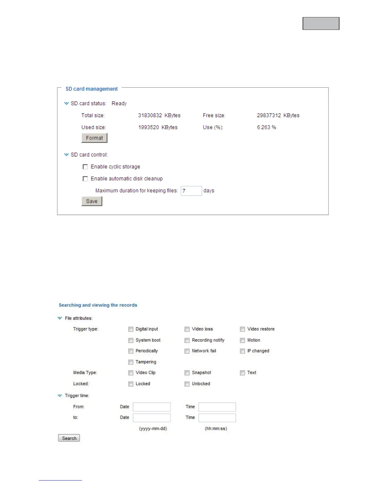 This section explains how you can manage the local memory (SD card) of the network camera. Cards of type