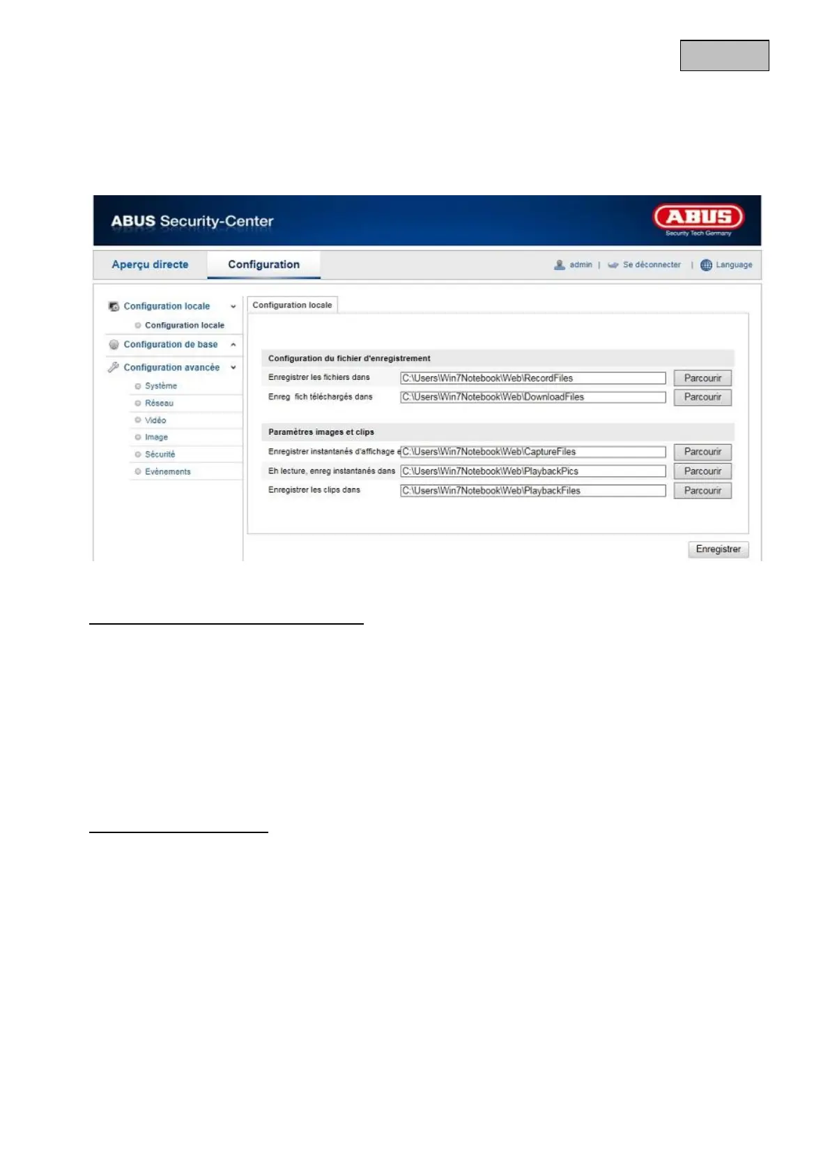 Vous pouvez enregistrer ici le chemin sous lequel les vidéos doivent être enregistrées.