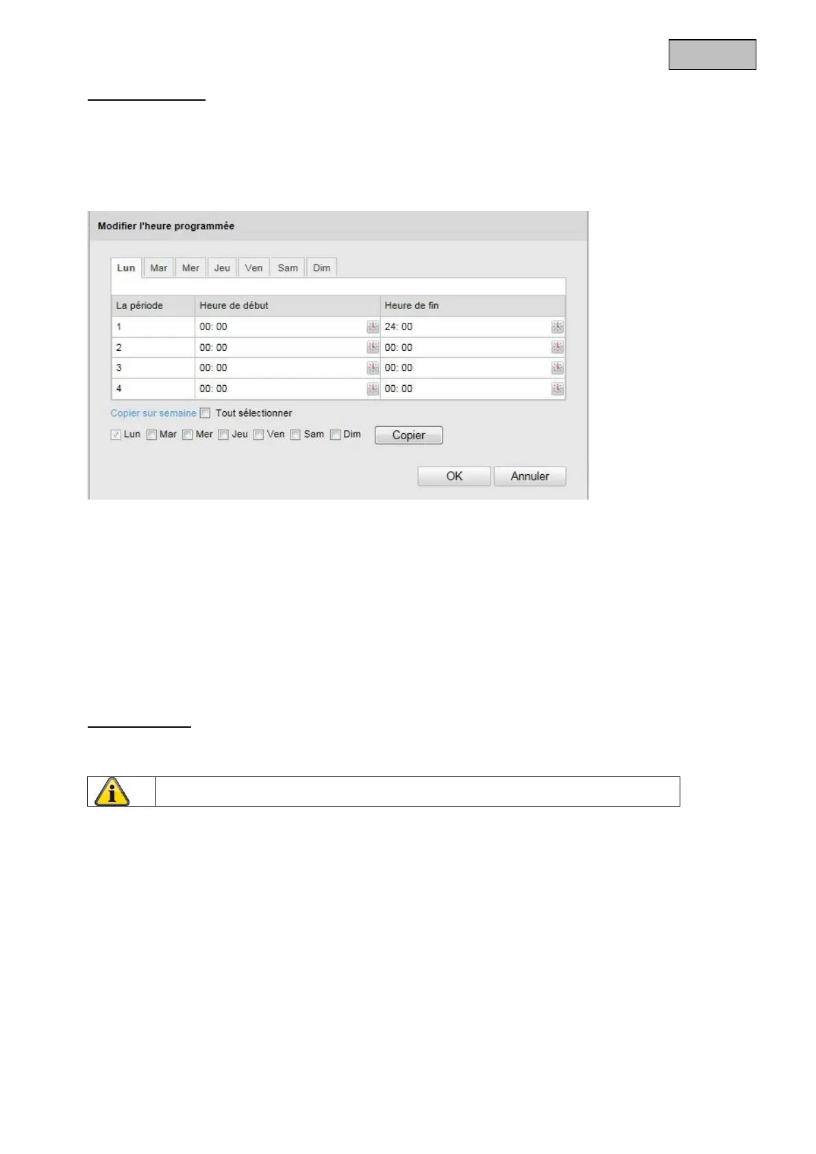 détection de mouvements sur toute la journée, sélectionnez 00:00 comme heure de début et 24:00 comme