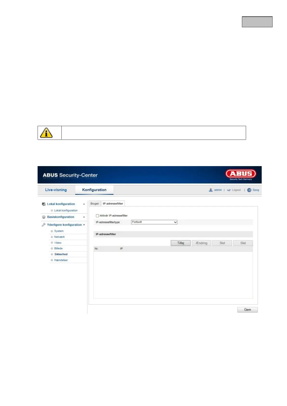 Tilladt: IP-adresserne, der er defineret nedenfor, accepteres til en adgang til kameraet.