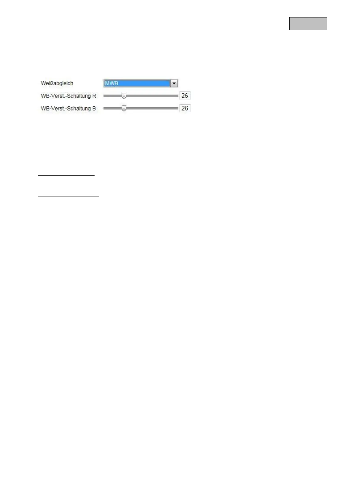 Sie haben folgende Optionen zur Auswahl: „MWB“, „AWB1“, „AWB2“, „Gesperrt WB“, „Leuchtstofflampe“,
