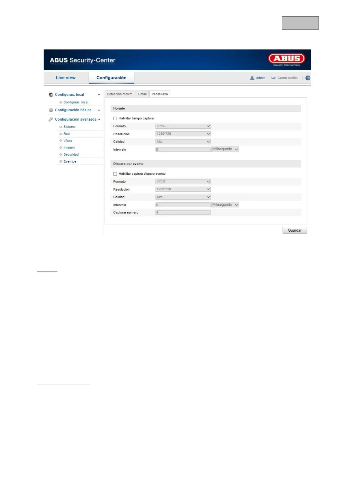 Aquí puede configurar las capturas con activación horaria y con activación por evento.