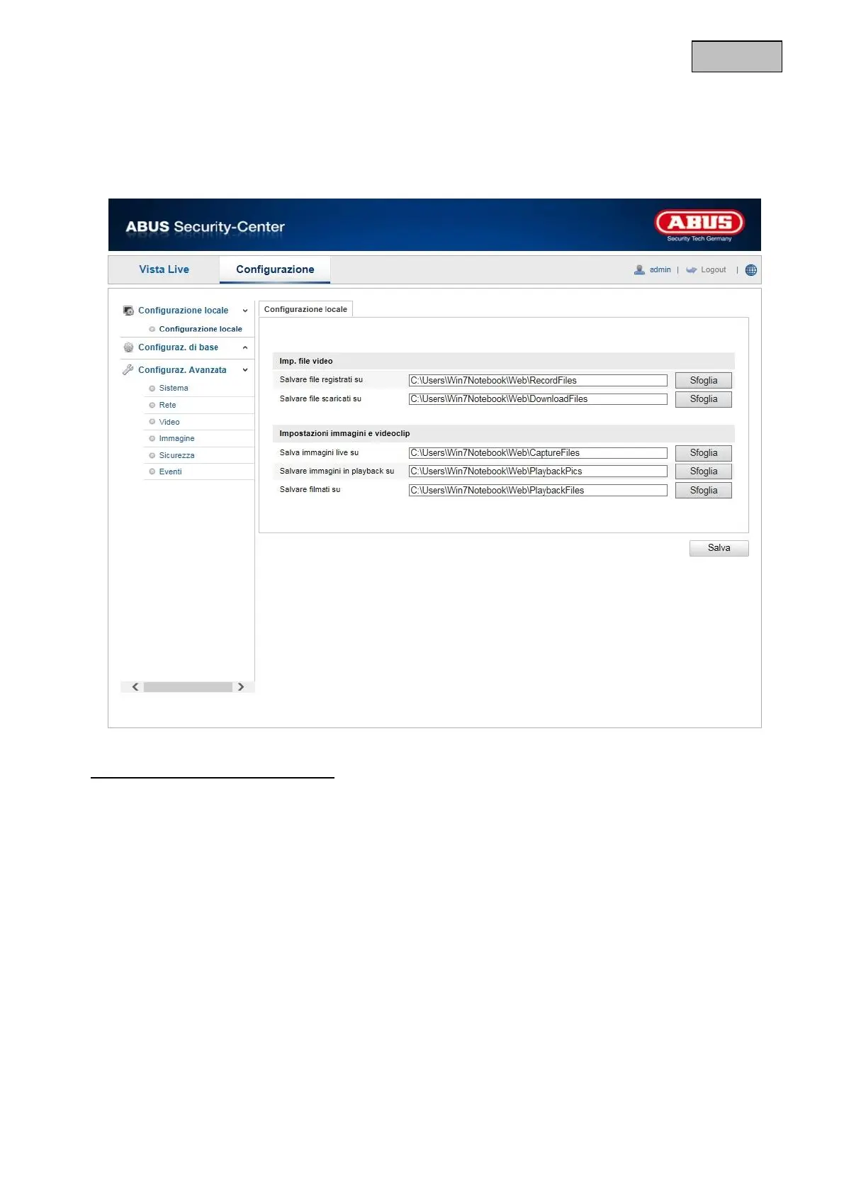 Alla voce di menu “Configurazione locale” è possibile effettuare le impostazioni per la vista live, il percorso dei