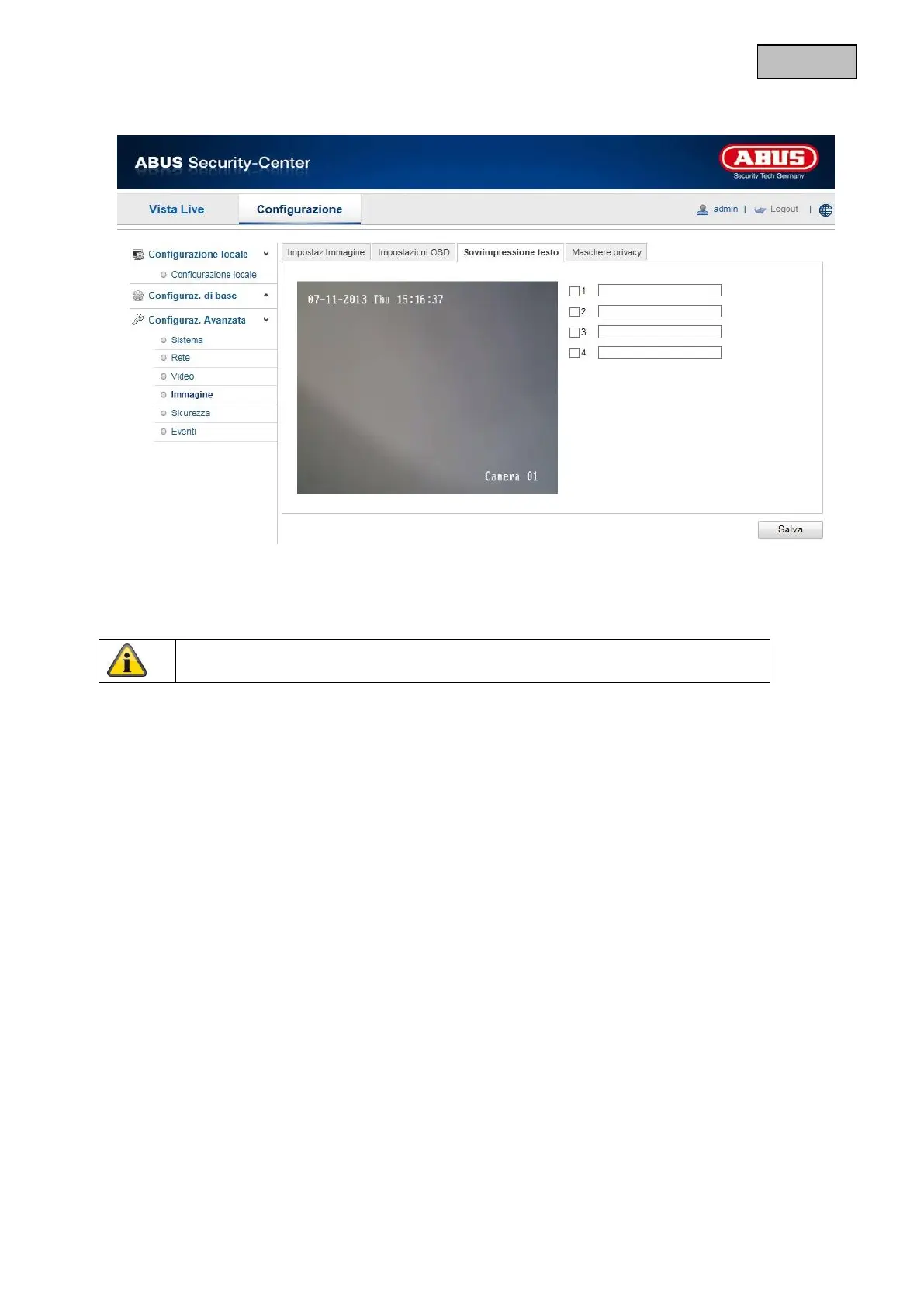 Sull’immagine della videocamera è possibile visualizzare fino a 4 testi, la cui lunghezza massima corrisponde