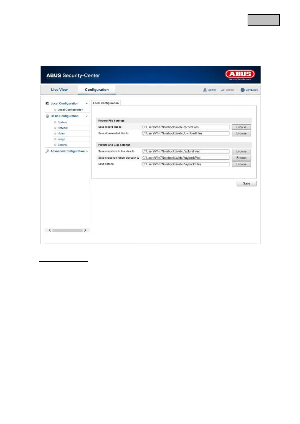 Under the “Local Configuration” menu item, you can make settings for the live view, file paths of the