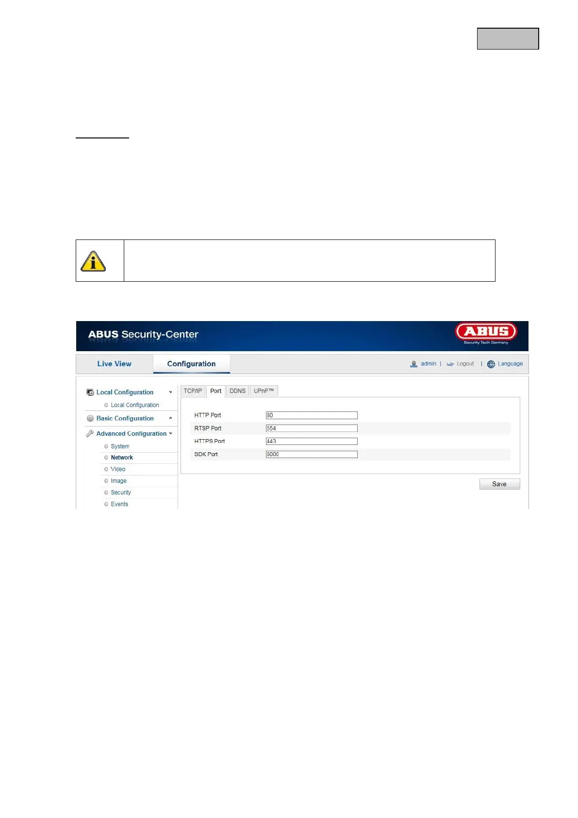 The standard port for RTSP transmission is 554. As an alternative, this port can be assigned a value in the