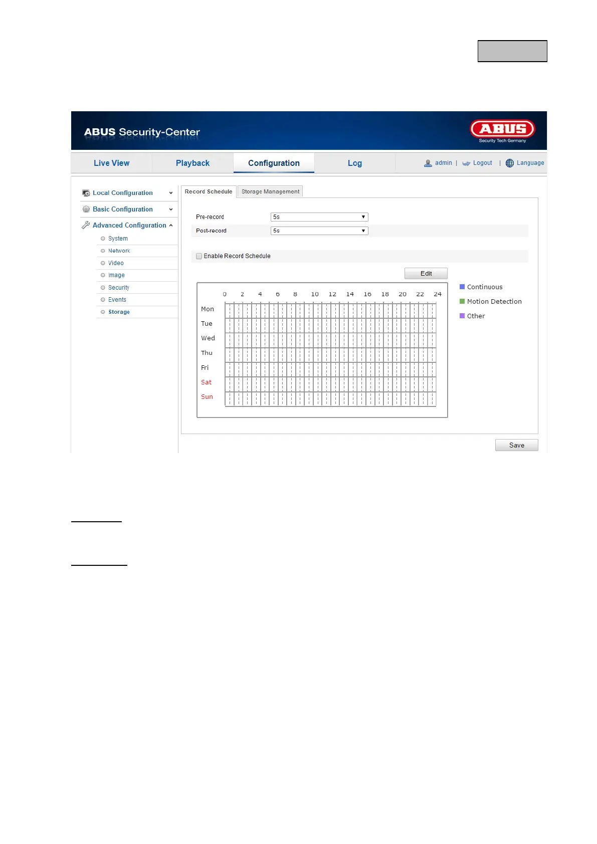 Here, you can set the configuration for time and event-triggered recordings in order to be able to save