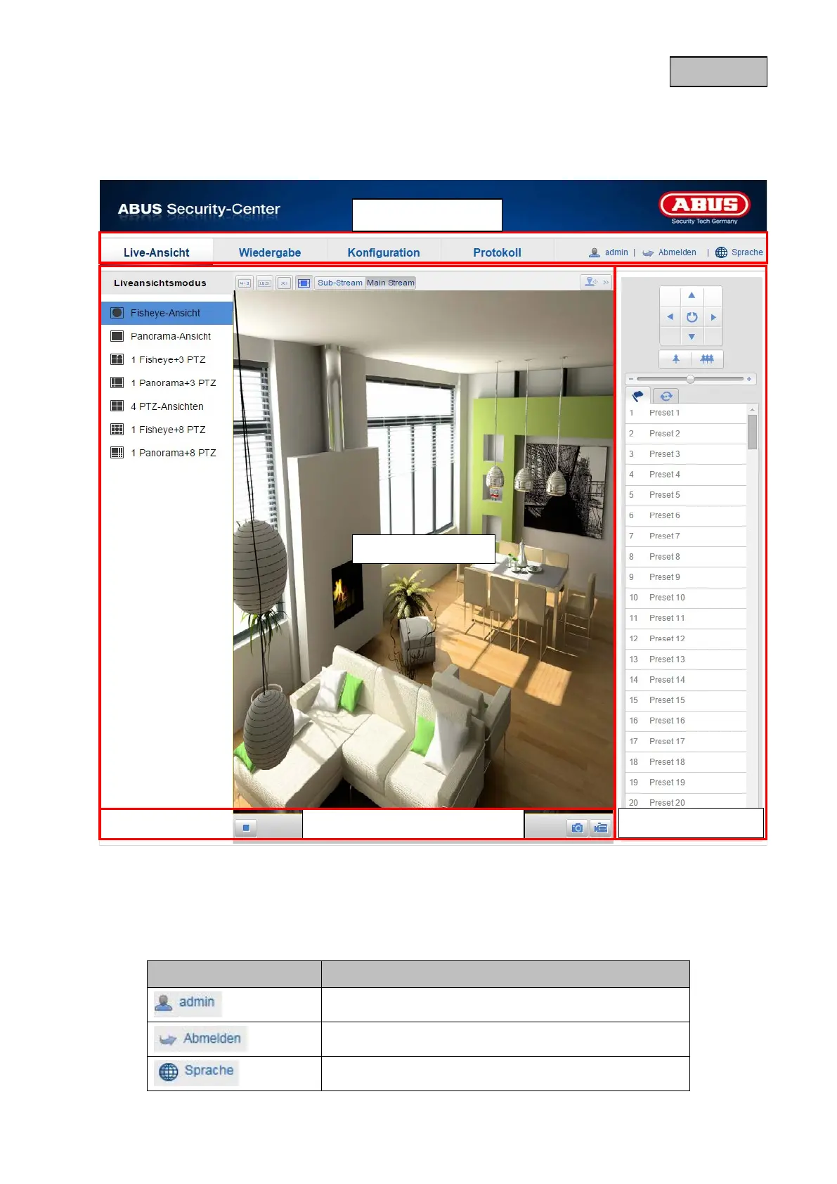 Öffnen Sie die Startseite der Netzwerkkamera. Die Oberfläche ist in folgende Hauptbereiche unterteilt: