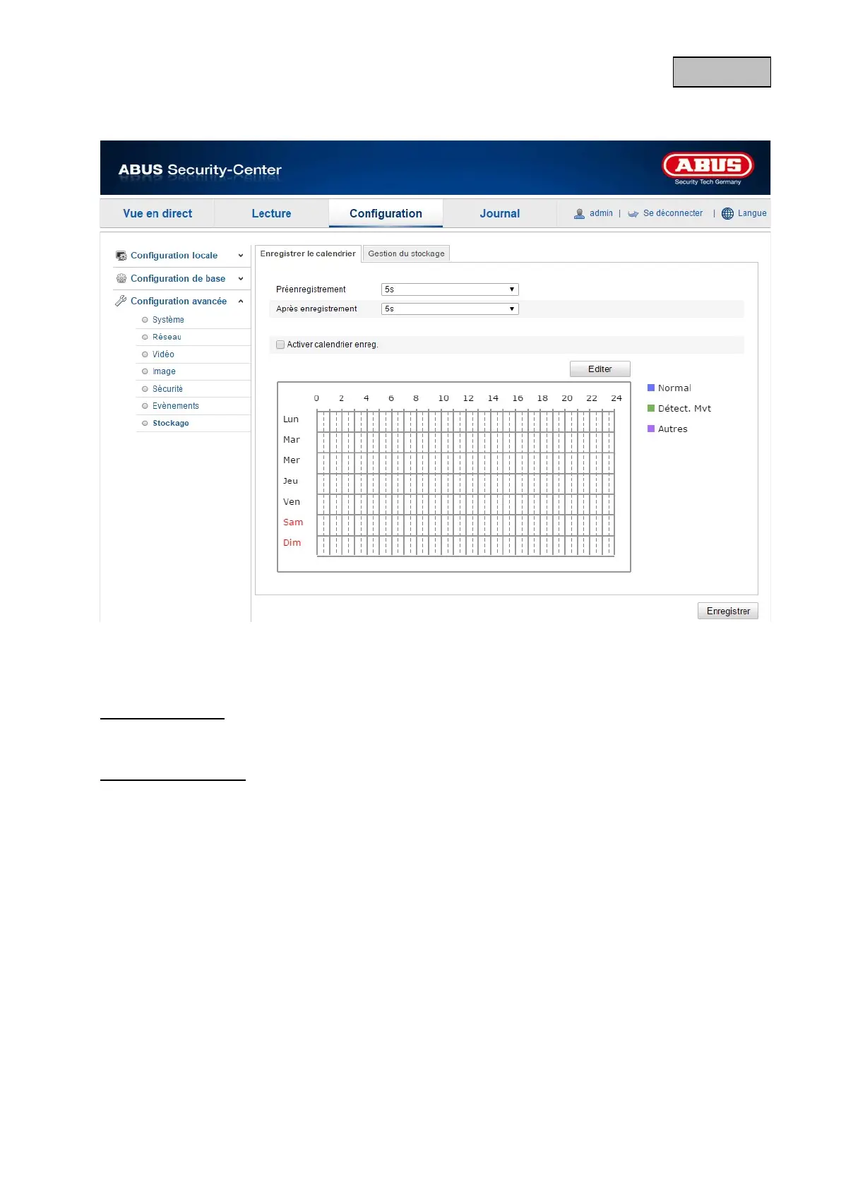 Vous pouvez effectuer ici la configuration pour les enregistrements programmés ou déclenchés par