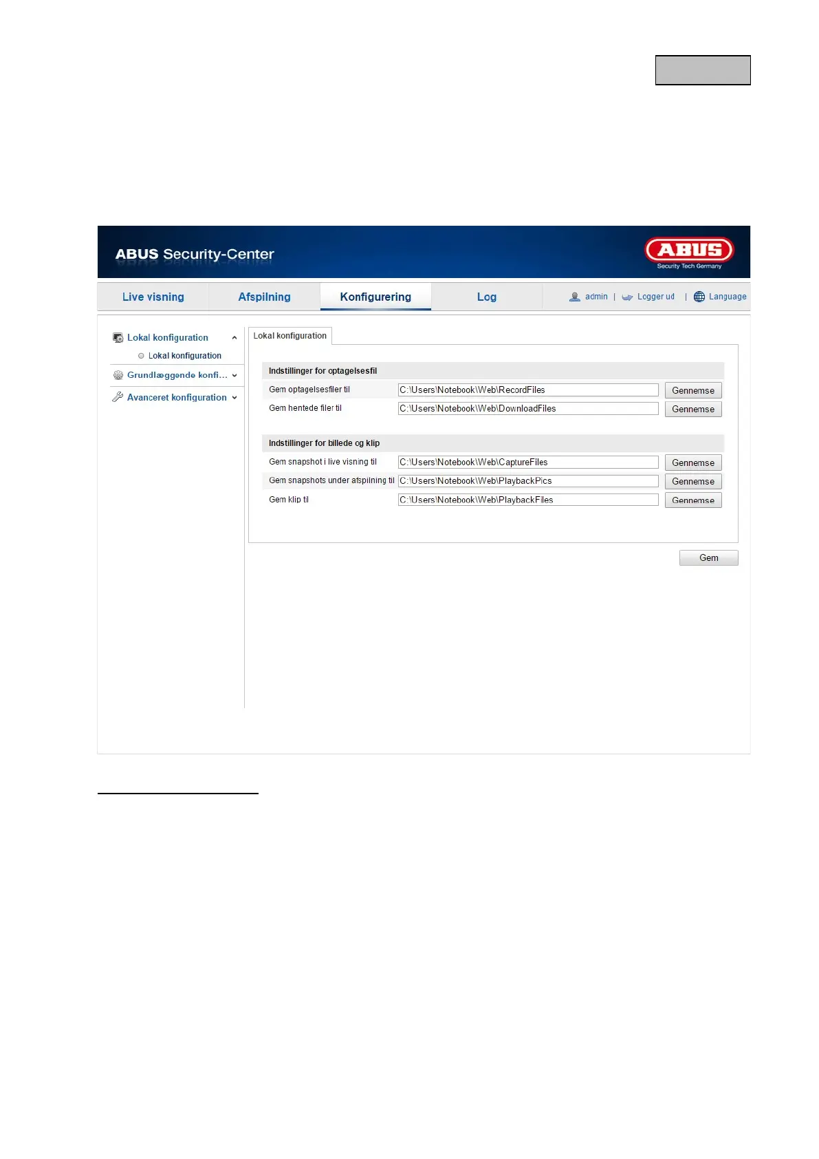 Under menupunktet "Lokal konfiguration" kan du indstille filstier for optagelsen og