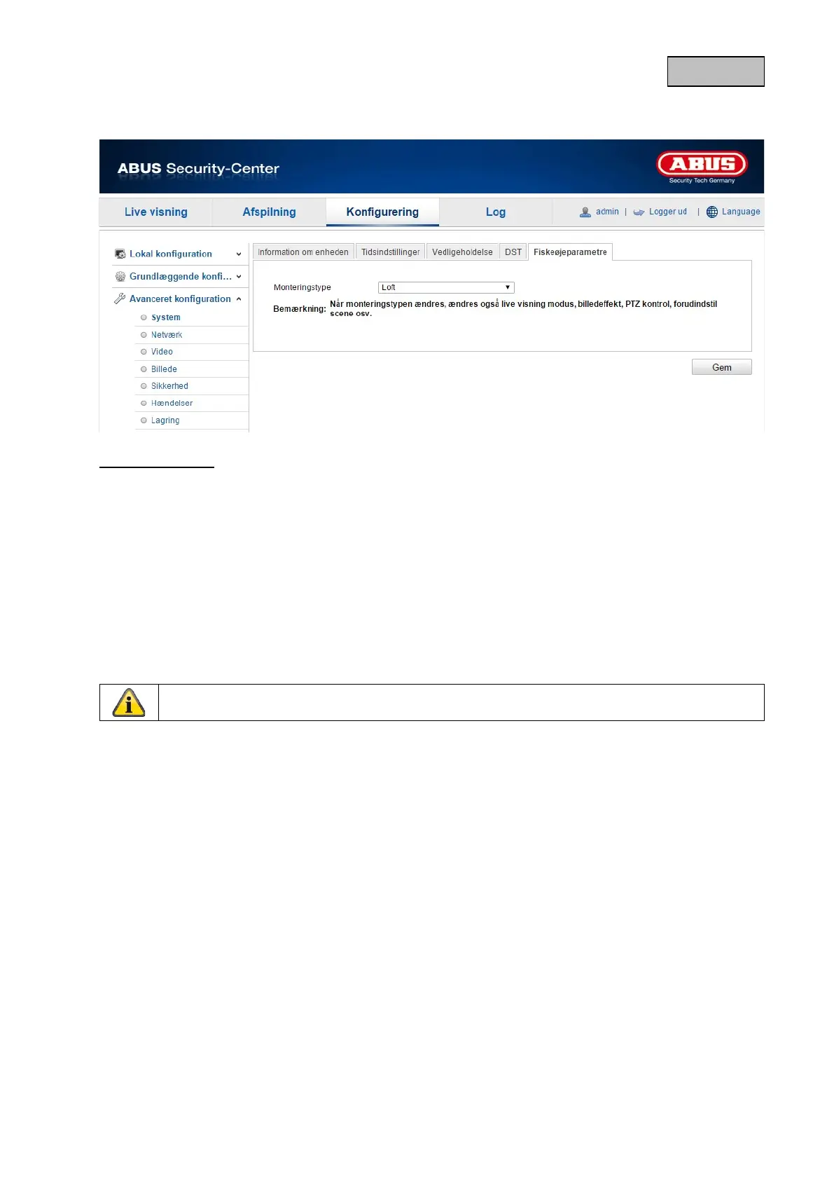En ændring af installationsmåden påvirker livevisningsmodus, billedeffekter, PTZ-styring og preset-