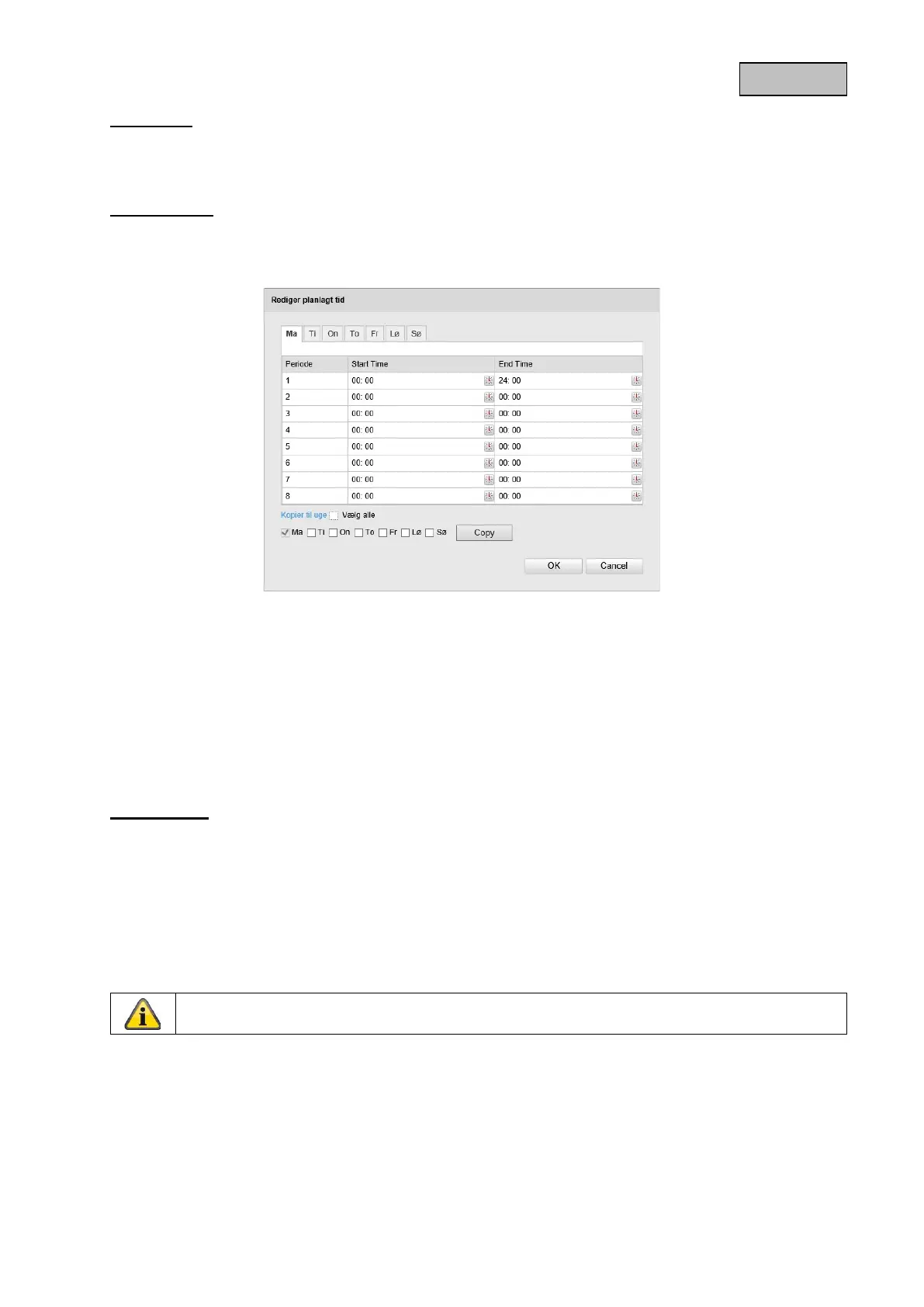 Et nyt vindue åbnes, hvor du kan definere ugedage og klokkeslæt for bevægelsesstyret optagelse.