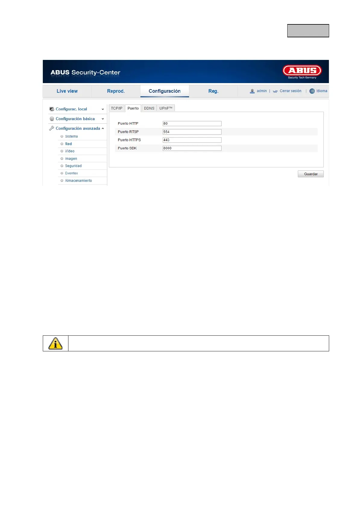 El puerto estándar para la transmisión SDK es 8000. Puerto de comunicación para datos internos. De