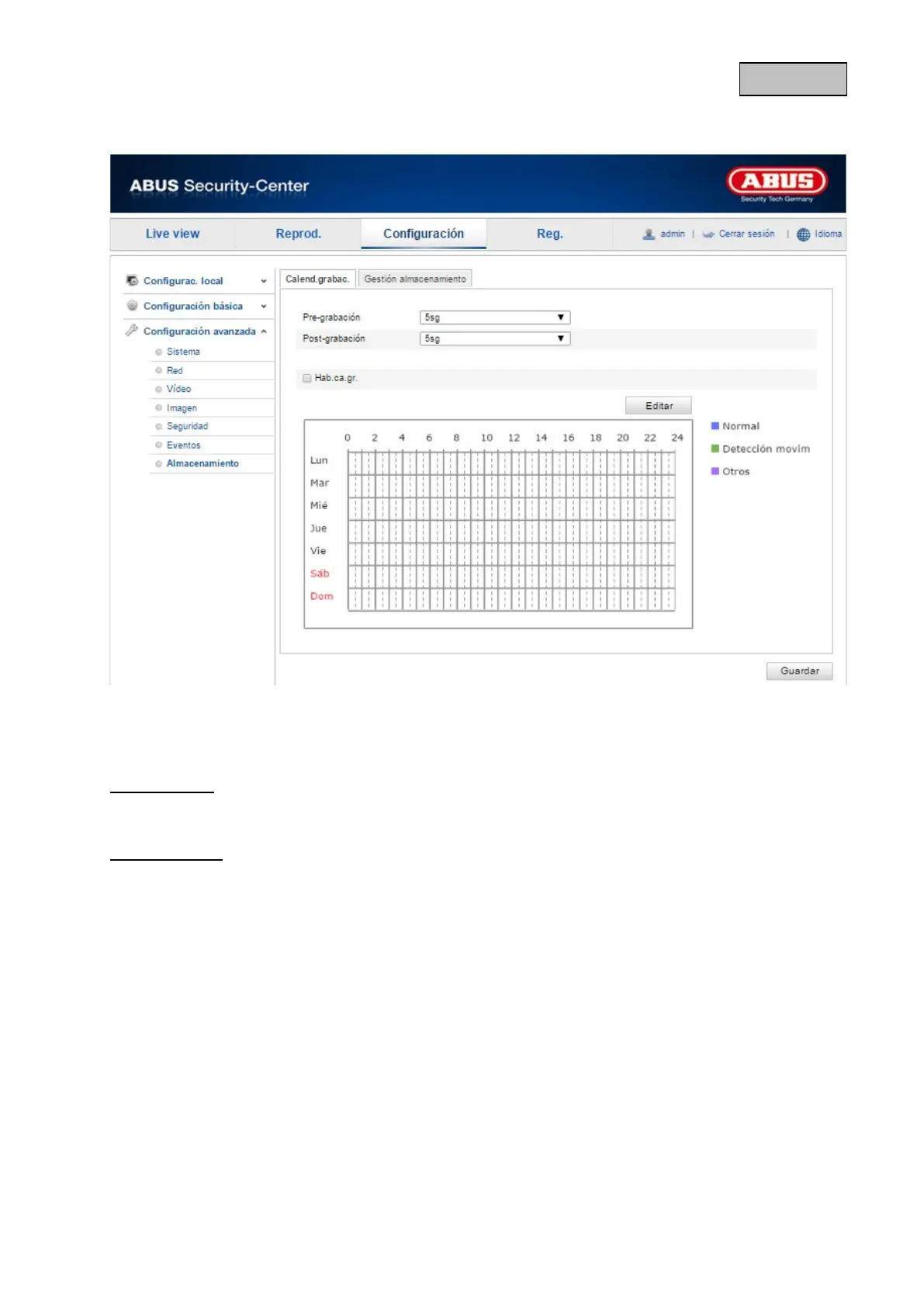 Aquí puede configurar la grabación con activación horaria y con activación por evento para guardarlas