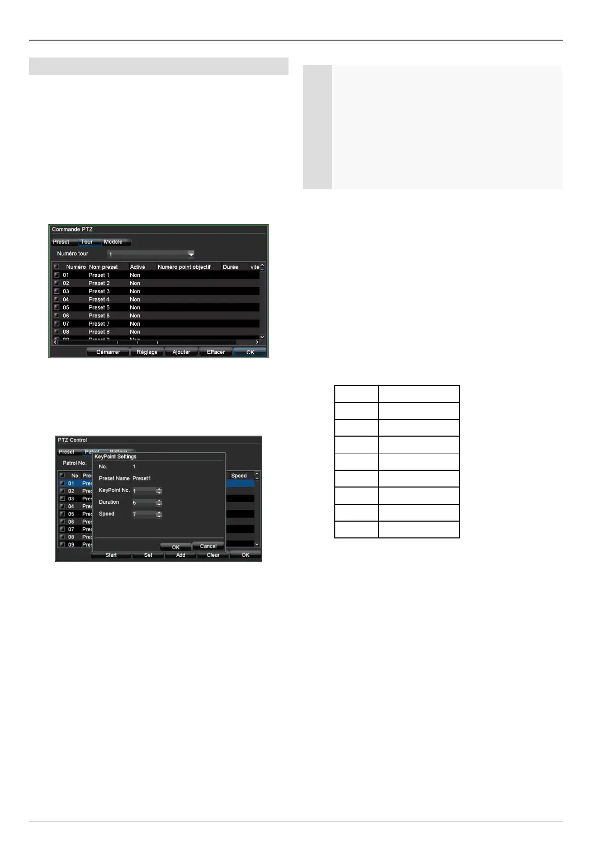 figuration de tours dans la caméra PTZ, consultez le ma-