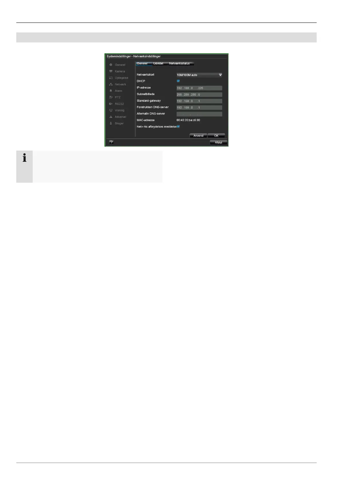 3. DHCP ikke aktiveret: Indtast dataene manuelt (IP-adresse, subnetmaske samt den standardmæssigt indstillede