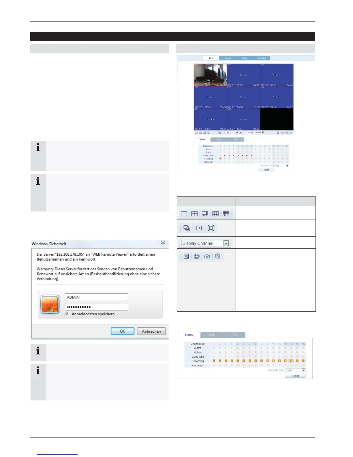 Displays the status of Alarm, Motion, Video loss, Re-