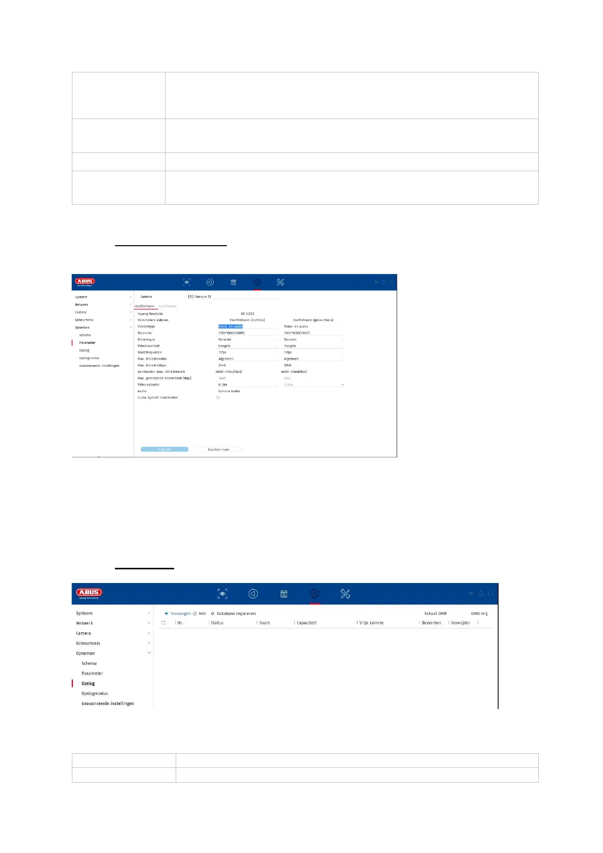 Hier kunt u de videoparameters voor stream 1 en 2 aanpassen.