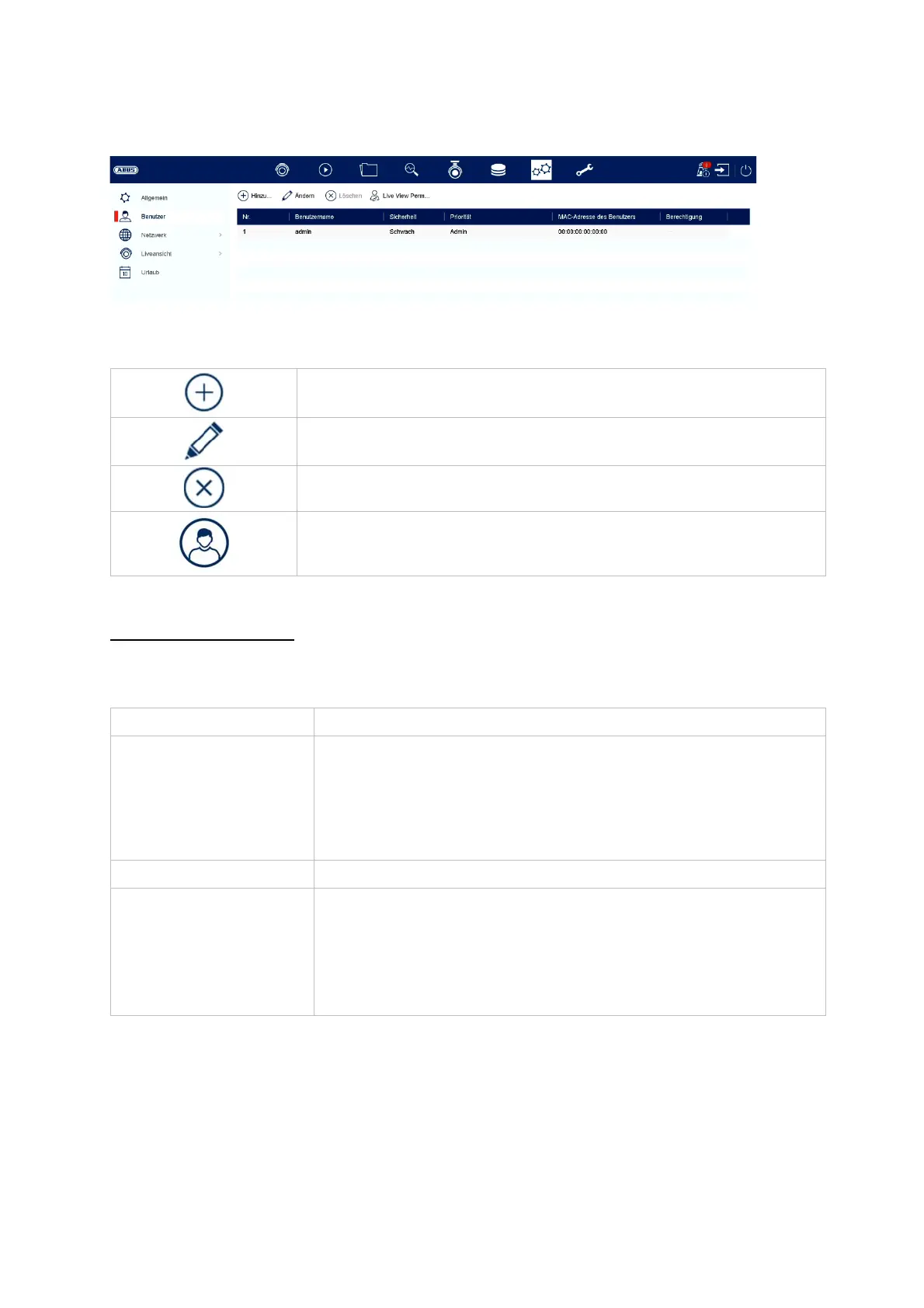 Benutzerberechtigung Wählen Sie die Berechtigungsstufe des Benutzers.