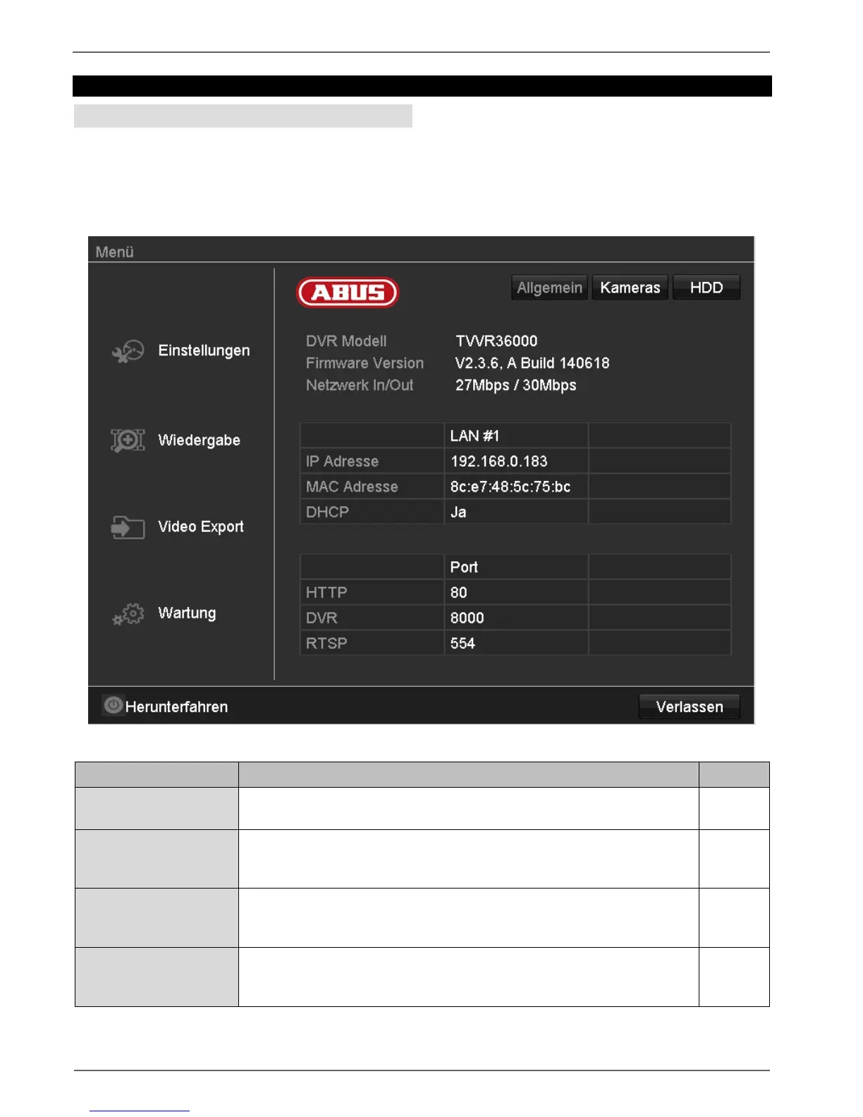 Leitet zu den Menüs Konfiguration, Kamera, Aufzeichnung, HDD, Wieder-