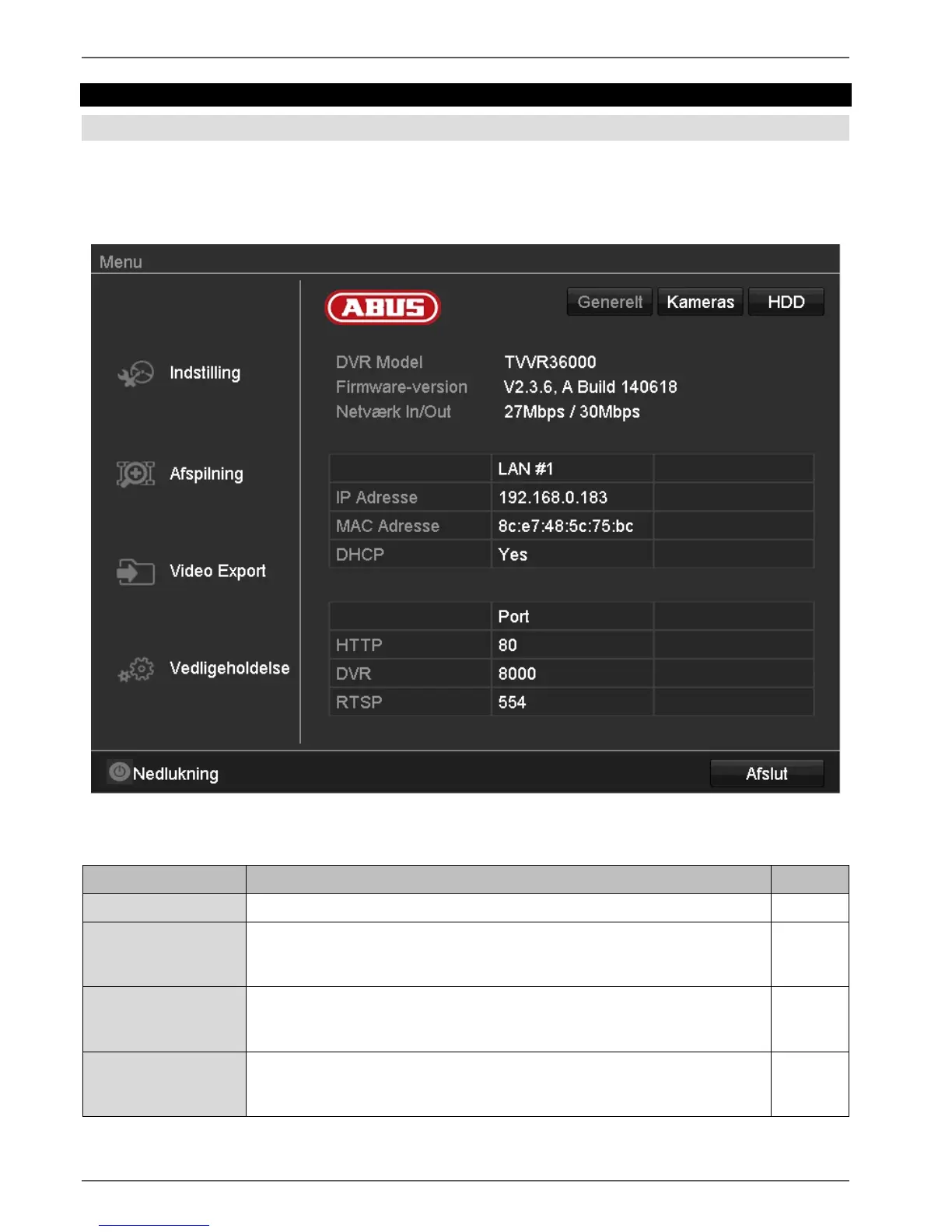 Leder videre til menuerne Konfiguration, Kamera, Optagelse, HDD, Afspilning.
